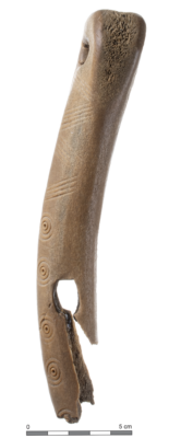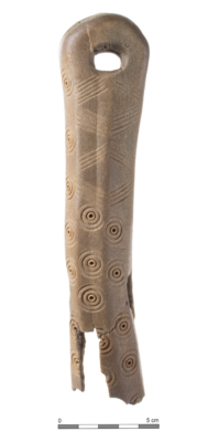 Gevonden in het Wateringse Veld in 2006. Dit benen voorwerp heeft ronde versieringen maar waarvoor het precies gediend heeft, is vooralsnog onduidelijk. Wel weten we uit onderzoek dat er banden door de gaten hebben gelopen in verschillende richtingen.